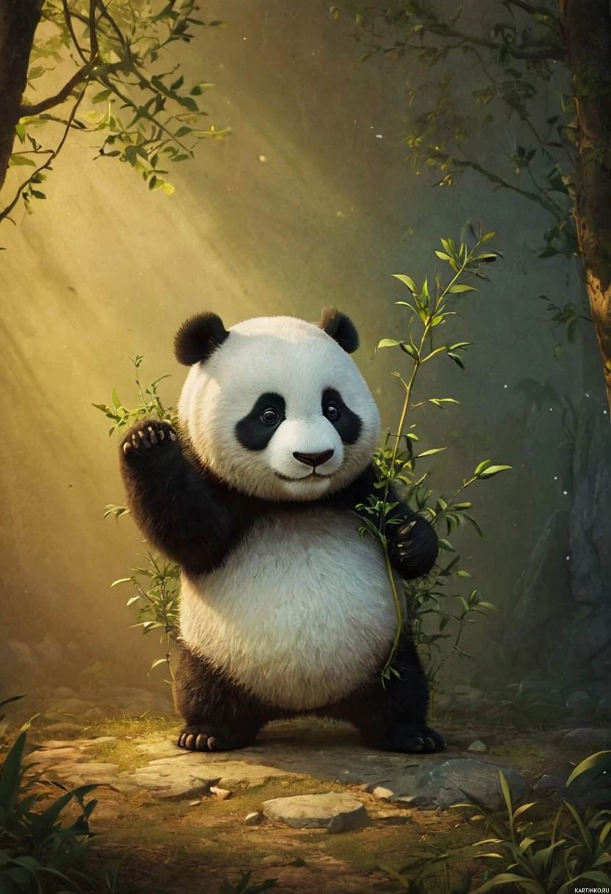 На картинке изображен стилизованный панда. У него большие круглые глаза, и он стоит на двух лапах. На заднем плане — спокойный природный пейзаж с деревьями и камнями, один из которых кажется куском дерева или бамбука в лапе панды, что отсылает к его естественной среде обитания.