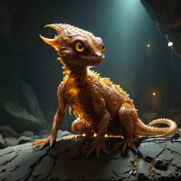 The image depicts a fantasy lizard creature sitting on a rocky ground. It appears to be in a cave-like setting with stone walls and what looks like fire or light sources around it, creating an ethereal ambiance. The creature has a long tail and small arms, suggesting it is not a typical terrestrial lizard but rather a fantastical one. Its skin tone could vary from green to orange, depending on the lighting in the scene.