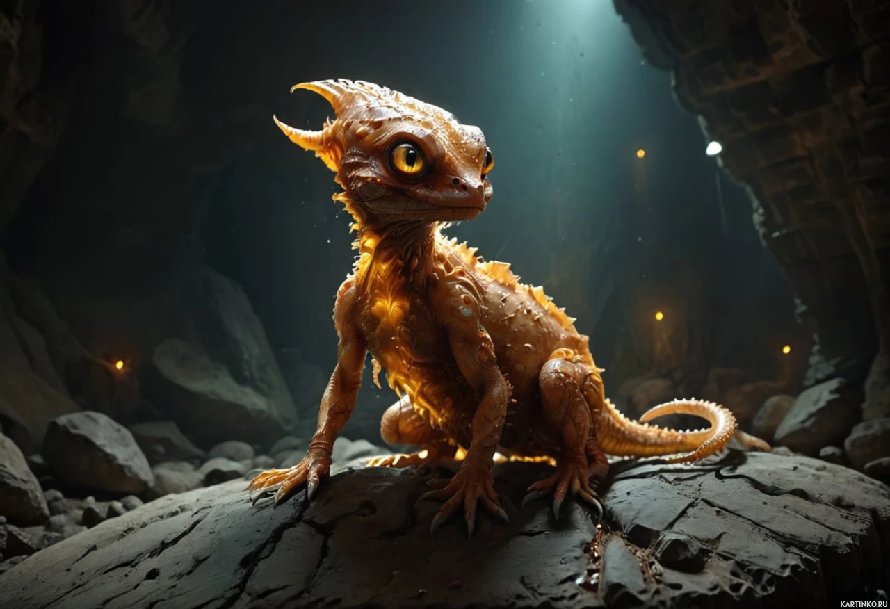 На картинке изображено фантастическое существо, похожее на ящера, сидящее на каменистой земле. Кажется, оно находится в пещерной обстановке с каменными стенами и источниками света, напоминающими огонь, создающими неземную атмосферу. У существа длинный хвост и маленькие лапы, что указывает на то, что это не обычная наземная ящерица, а скорее фантастическое создание. Оттенок кожи может варьироваться от зеленого до оранжевого в зависимости от освещения.