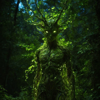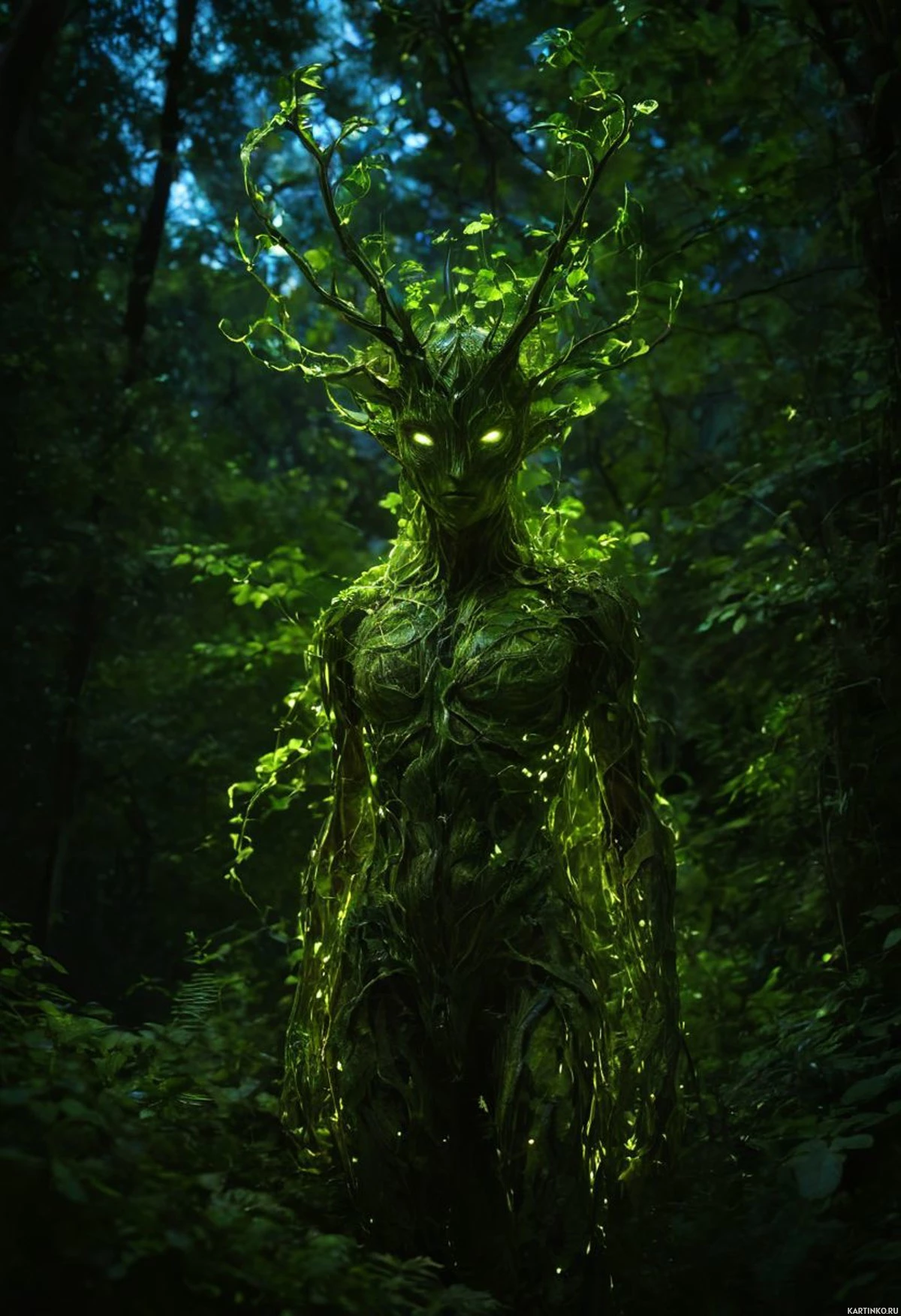 На картинке изображена фигура, стоящая в лесу ночью. Судя по всему, это гуманоид с мерцающими зелеными акцентами и, похоже, пламенем или энергией, исходящими из туловища. На лице — маска, украшенная рогами, являющимися частью ее дизайна. Фигура одета в доспехи, включая перчатки, которые также имеют светящиеся зеленые элементы. Место действия — влажный и туманный лес, окружающий фигуру. Деревья с листвой намекают на весну или лето, но темнота говорит о ночном времени суток. Освещение сосредоточено на центральной фигуре, выделяя ее на фоне более темного окружения. Стиль картинки — цифровая живопись, характерная для фэнтезийных жанров благодаря стилизованному и неземному облику персонажа.