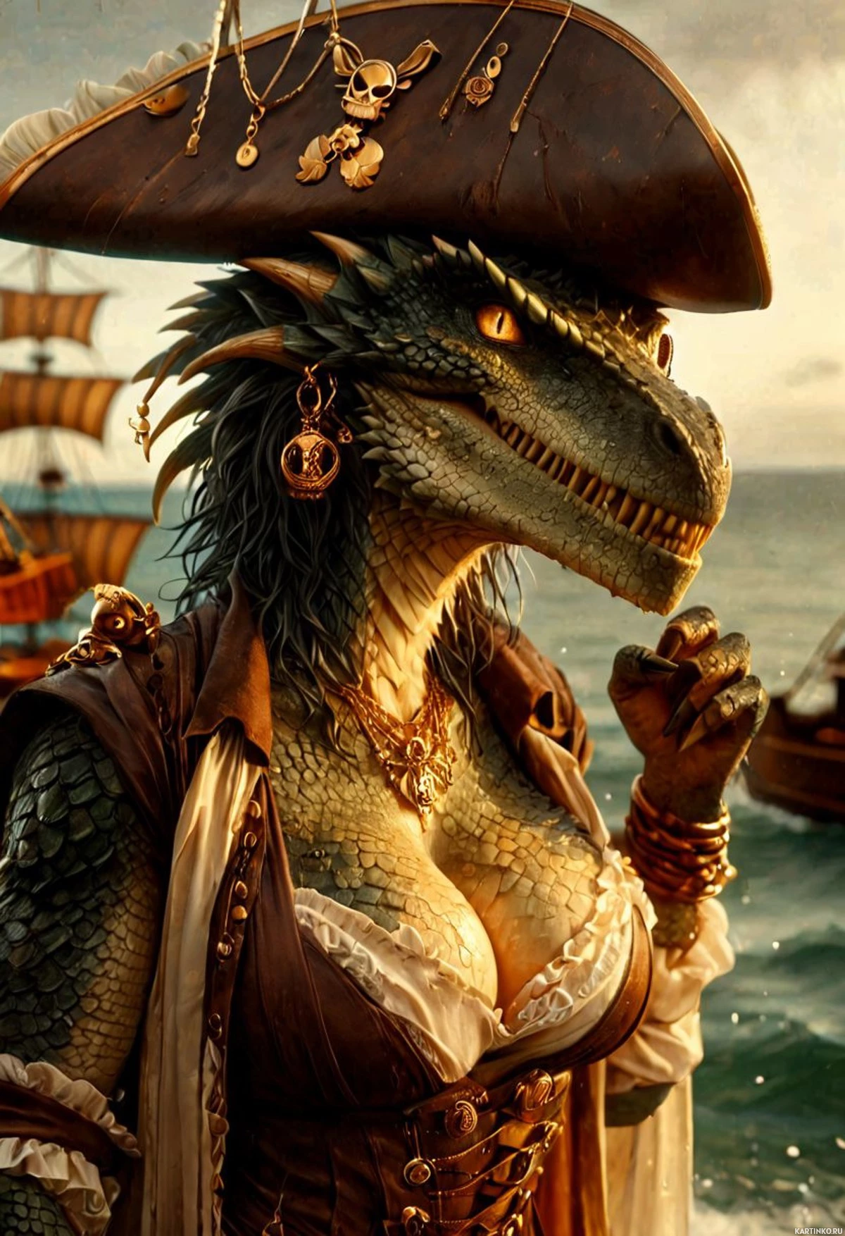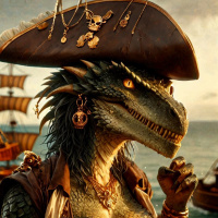 Картинка изображает антропоморфное существо с рептильными чертами и угрожающей ухмылкой, переодетое пиратом. На одном ухе у него большое золотое кольцо, а на голове – пиратская шляпа с пером. У персонажа чешуя и острый, заостренный нос, что указывает на дракона или похожего мифического зверя, усиливая фантастический характер картинки. На заднем плане – элементы традиционного пиратского корабля на бушующем море под пасмурным небом, с опущенными парусами и развевающимся флагом на мачте. Поза персонажа решительная: одна рука уверенно лежит на бедре, а в другой – пистолет, что говорит о готовности к битве или приключениям.