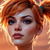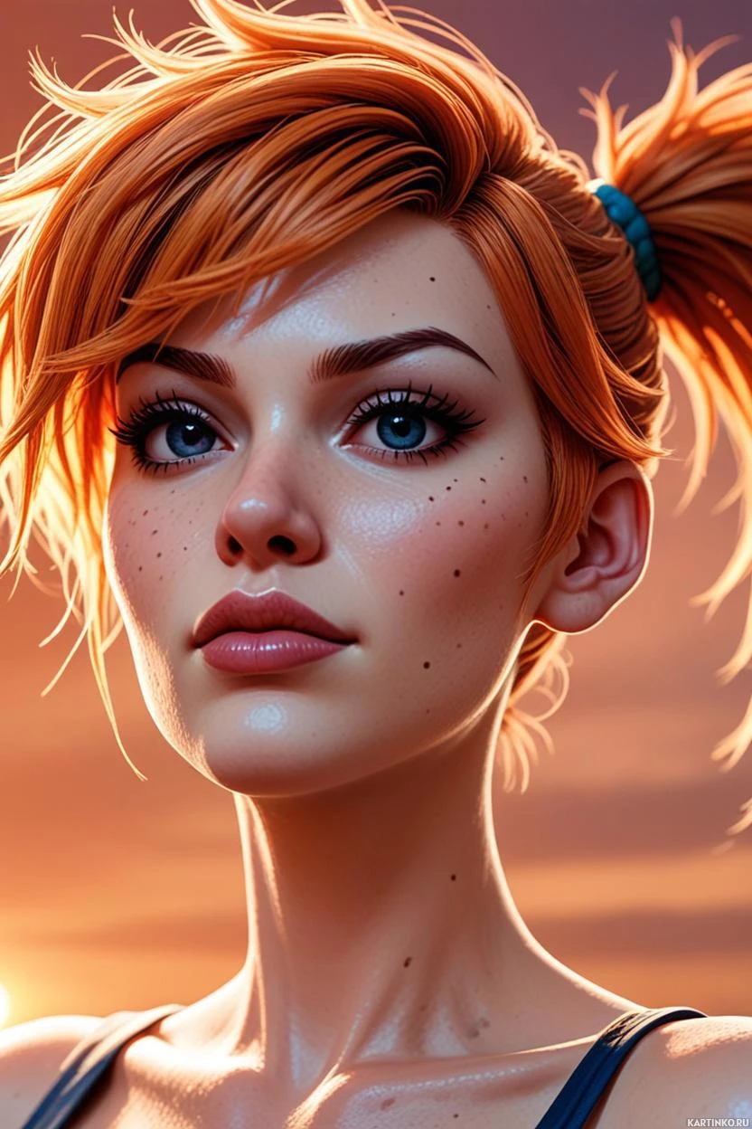 На картинке представлен стилизованный портрет человека с рыжими волосами, собранными в высокий хвост и закрепленными черной резинкой. На лице макияж с выразительными стрелками и глянцевыми губами, подчеркивающими черты лица. Взгляд направлен прямо на зрителя, создавая ощущение близости. Кожа имеет легкий блеск, возможно, из-за освещения или техник цифровой живописи. Фон минималистичный, в теплых тонах, гармонирующих с оттенками волос и кожи, что акцентирует внимание на деталях, не отвлекая от главного.