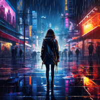 На картинке ночная улица во время дождя. На переднем плане стоит одинокая фигура, смотрящая на происходящее. На человеке тёмное пальто с поднятым капюшоном, скрывающим лицо. Похоже, он один среди других людей, которых видно на улице. За ним несколько человек идут по тротуару. На них разная одежда, что говорит о холодной погоде из-за дождя. Дома возвышаются над сценой и украшены неоновыми вывесками, освещающими мокрые улицы разноцветным светом. Общая атмосфера картинки – гнетущая, благодаря темноте ночи и дождю, создающая меланхоличное настроение.