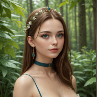 In the image, a young woman with long brown hair is standing in a wooded area. She is wearing an ornate green dress with white lace trim and has a floral crown on her head. Her expression is neutral as she gazes directly into the camera. The forest around her is lush with various trees and foliage, creating a serene and mystical atmosphere.