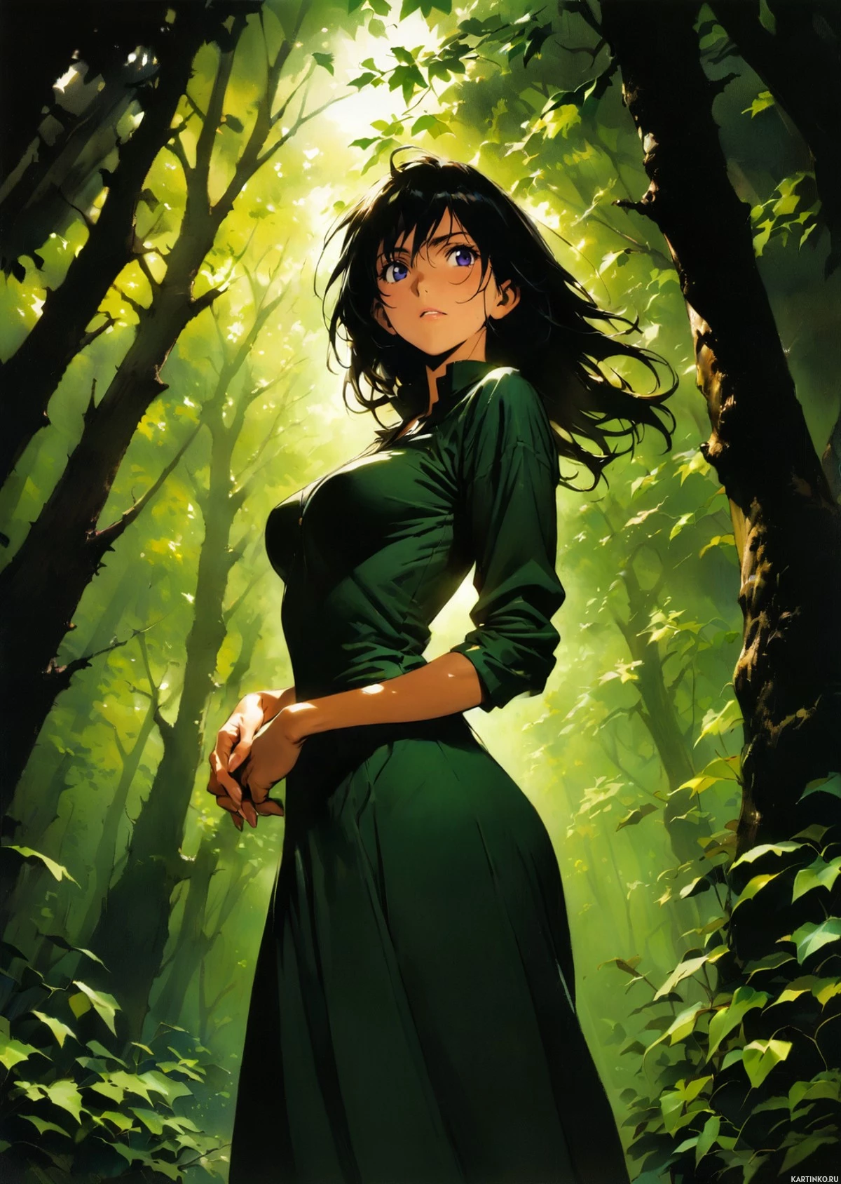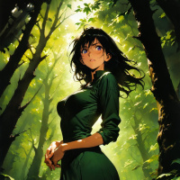 На картинке в центре стоит молодая брюнетка с длинными волосами. Одна рука у неё покоится на бедре, другая – нежно приложена к боку. На ней длинное зелёное платье, которое контрастирует с тёмными волосами. Выражение её лица задумчивое, она смотрит вдаль. За её спиной раскинулся густой лес с высокими деревьями и пышной растительностью, создавая ощущение волшебства или сказочной атмосферы. Солнечный свет пробивается сквозь листву над головой, окутывая её фигуру тёплым сиянием.