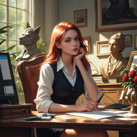 На картинке женщина сидит за столом, заваленным бумагами, с ручкой в руке, словно занята какой-то работой или пишет. У неё рыжие волосы, и похоже, она одета в темную куртку поверх светлой блузки. Комнату украшают произведения классического искусства, включая, кажется, бюст мужчины на стене позади неё. Слева на стене висит рамка с фотографией другого человека. На заднем плане видны книги и декоративные предметы. Выражение её лица задумчивое, она смотрит на бумаги. В комнате царит атмосфера старины, что подчеркивается стилем мебели и классическими произведениями искусства.