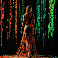The image shows a person standing with their back to the camera, set against a background that appears to be illuminated by colorful lighting effects, which could be interpreted as an explosion of colors or paint splatter. The individual is wearing a dress that seems to have an embellishment resembling feathers or perhaps a textile with a glittery effect.