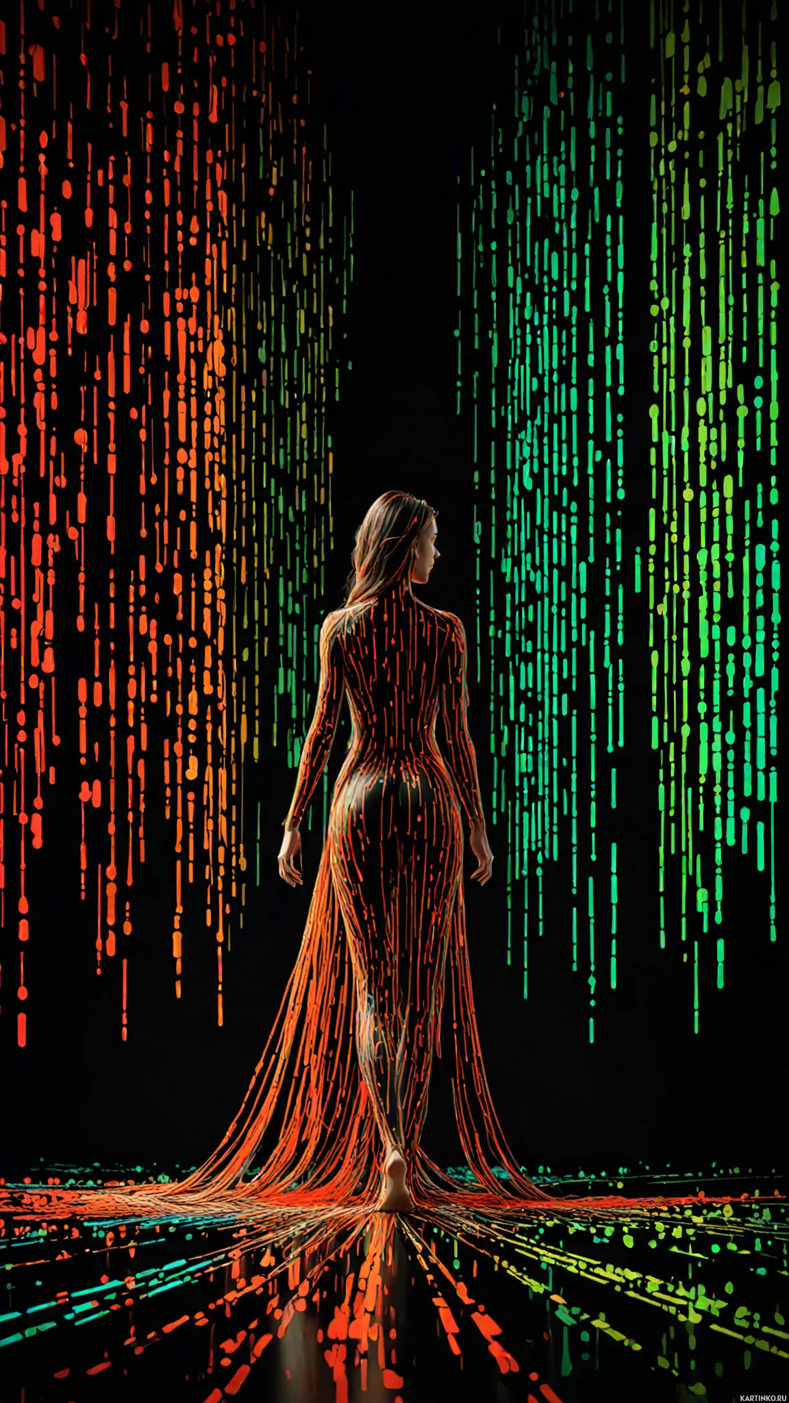 На картинке изображен человек, стоящий спиной к камере, на фоне ярких, разноцветных световых эффектов, похожих на взрыв красок или брызги. На нем нарядное платье, украшенное чем-то, напоминающим перья или блестящую ткань.