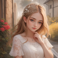 На картинке изображена женщина, стоящая на улице с мощёной каменной плиткой и цветами. У неё длинные каштановые волосы, а на ней белое, детализированное платье, дизайн которого отсылает к средневековью или фэнтези. Выражение её лица задумчивое: одна рука прислонена к подбородку, другая покоится возле губ. Стиль работы реалистичный, с акцентом на фотореализм, что особенно заметно в текстуре кожи и сложных деталях платья.
