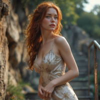 На картинке, силуэт рыжеволосой девушки виден сзади, когда она поднимается по каменным ступенькам. На ней светлое платье с корсетом и длинными рукавами. Судя по освещению, действие происходит на улице в сумерках или ранним вечером, на заднем плане справа видны деревья.