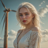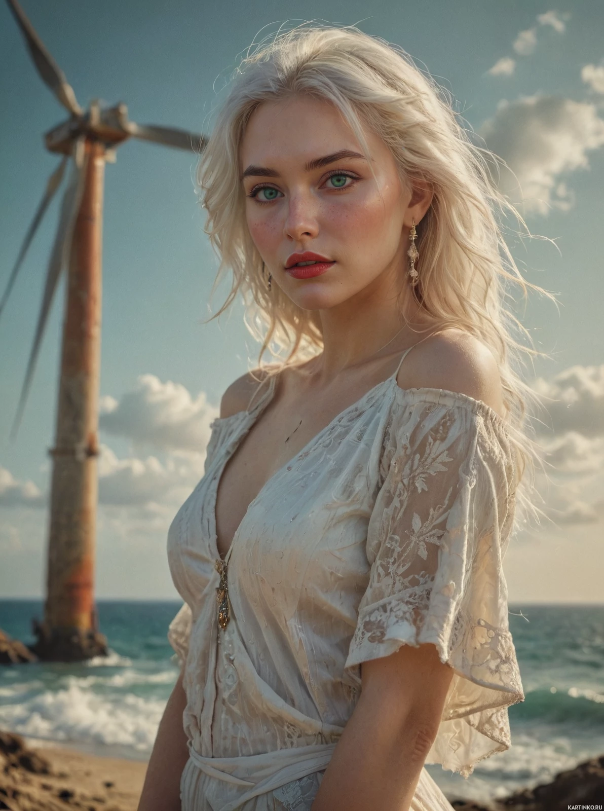 In the image, a woman with blonde hair and a dress that seems to be of a light cream or off-white color stands on what appears to be a rocky coastline. The background features elements associated with seaside locales, such as a lighthouse and a wind turbine in the distance.