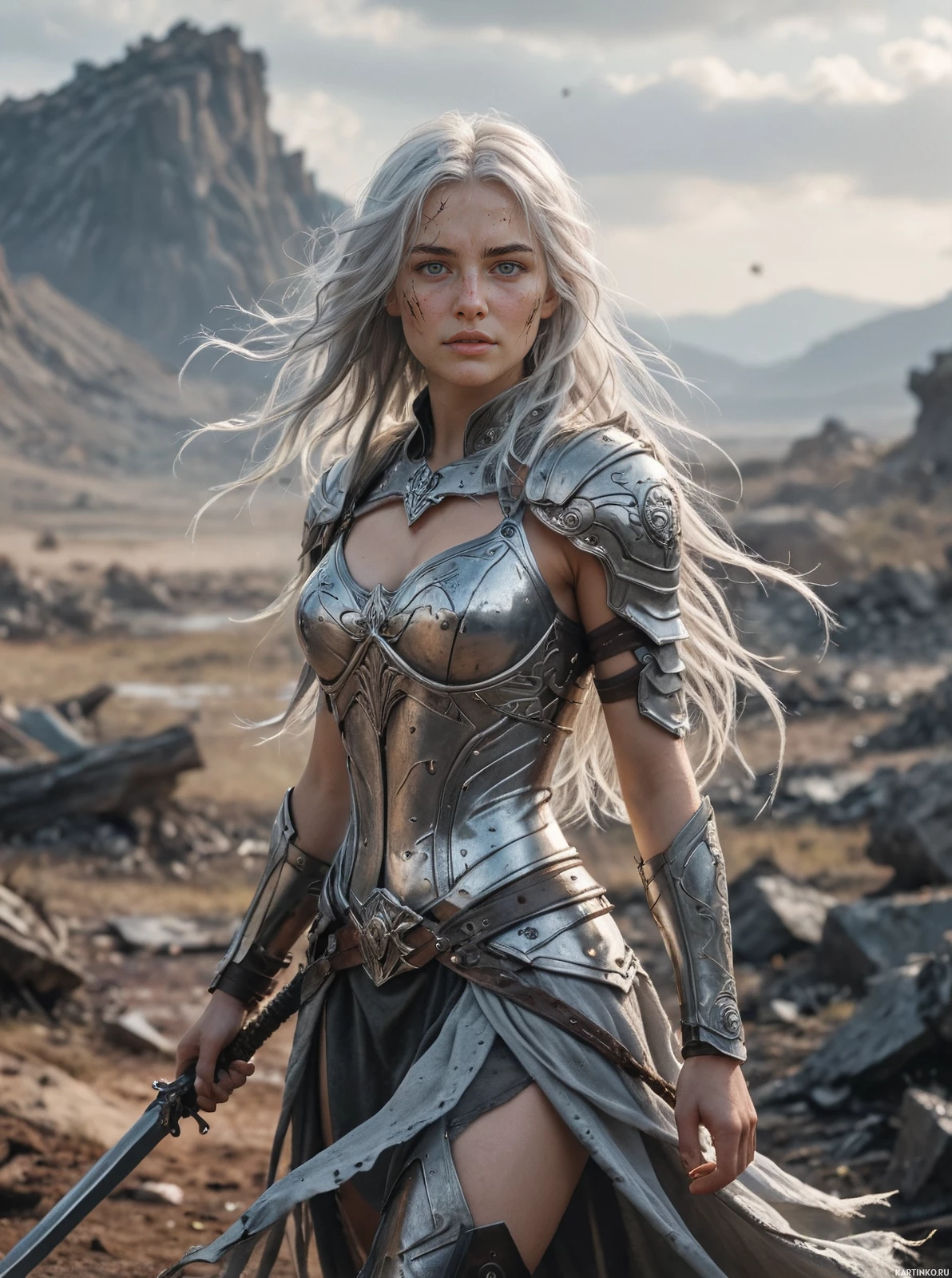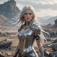 На картинке стоит уверенная женщина с белыми волосами на фоне скалистых выступов и чистого неба. На ней доспехи с замысловатым орнаментом, включающие металлические пластины и нагрудник, подчеркивающие её внушительность. На левой руке она носит перчатку с острыми шипами, что говорит о готовности к бою. В правой руке – меч, усиливающий ощущение боевой готовности. Общая картина излучает силу и стойкость.