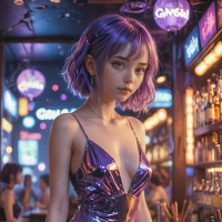 The image features a young woman with purple hair styled in a bob cut. She has a tattoo on her right arm. Her attire consists of a sleeveless dress that is primarily in shades of blue and pink, with the bottom part being predominantly blue. The dress has a high neckline and appears to be made of a glittery or metallic fabric. The woman is seated at what looks like a bar counter, with her left hand resting on the countertop. The environment suggests an indoor setting with artificial lighting, possibly in the evening given the muted color tone of the photo.