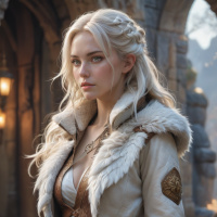 The image depicts a female character with white hair, wearing a detailed armor and accessories that suggest a fantasy setting. She has a stern expression on her face and is looking directly at the viewer. Her attire includes intricate embellishments and gold accents, indicating that she may be of high status or importance within the context of the image's narrative. The background features stone walls with arches and what appear to be torches providing illumination, which adds to the medieval or dungeon-like atmosphere of the scene.
