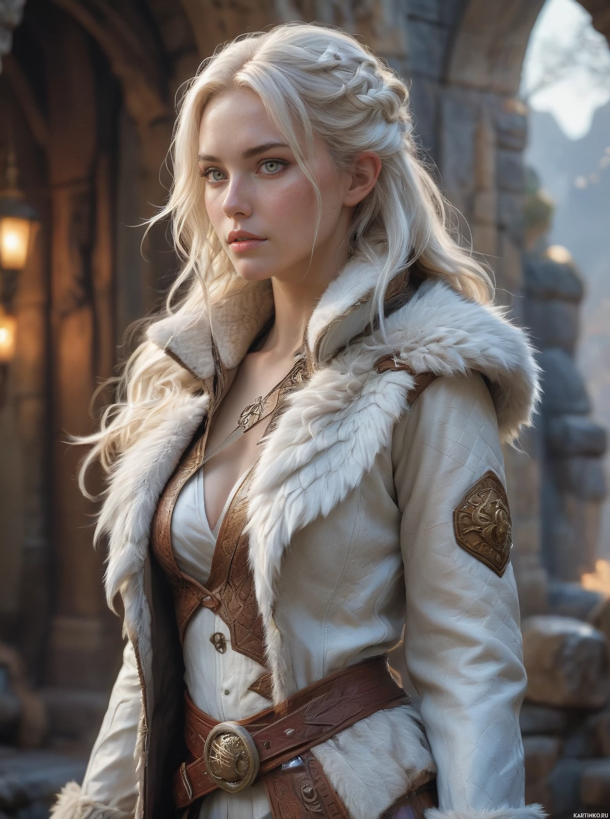 На картинке изображена женщина с белыми волосами в сложной броне и аксессуарах, что отсылает к фэнтезийному миру. На её лице – суровое выражение, и она смотрит прямо на зрителя. Её наряд украшен замысловатыми деталями и золотыми акцентами, что говорит о её высоком статусе или важности в сюжете картинки. На заднем плане видны каменные стены с арками и факелами, освещающими сцену, создавая атмосферу средневековья или подземелья.