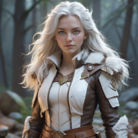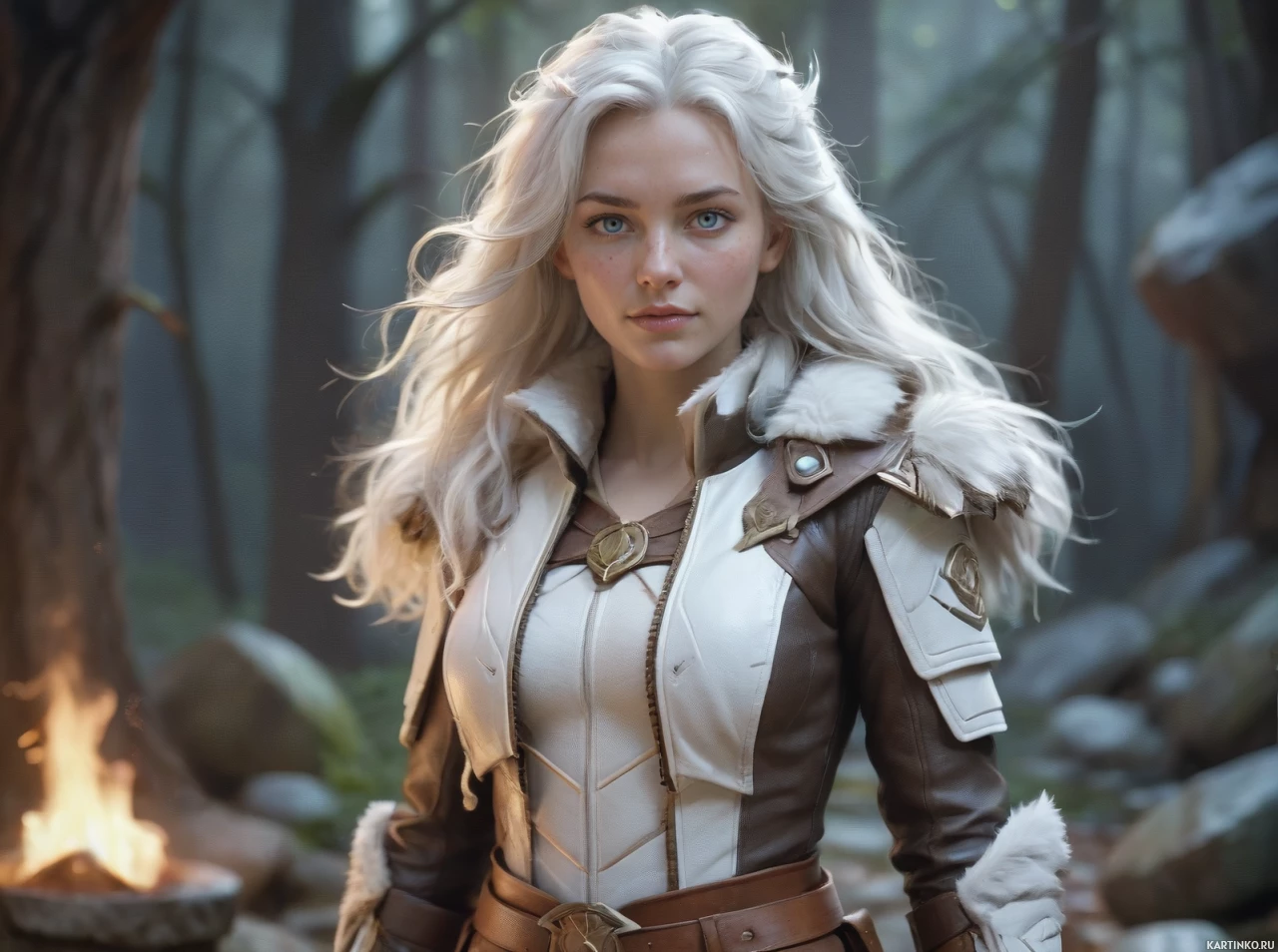 На картинке изображена женщина, стоящая в лесу, окутанном таинственной, готической атмосферой. У неё белые волосы и доспехи с меховой отделкой на плечах и груди. Выражение лица серьёзное, и она смотрит прямо в камеру.