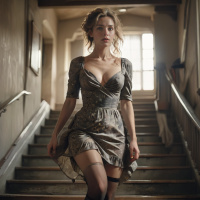 In the image, a young woman is descending an old, narrow staircase with creaky wooden steps and a rustic metal handrail. She is wearing a long-sleeved floral dress that reaches just above her knees. Her gaze is directed off to the side, and her expression seems contemplative or perhaps slightly concerned. The setting suggests an interior space that could be part of an old building, possibly with historical significance due to its design elements.