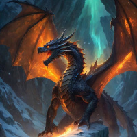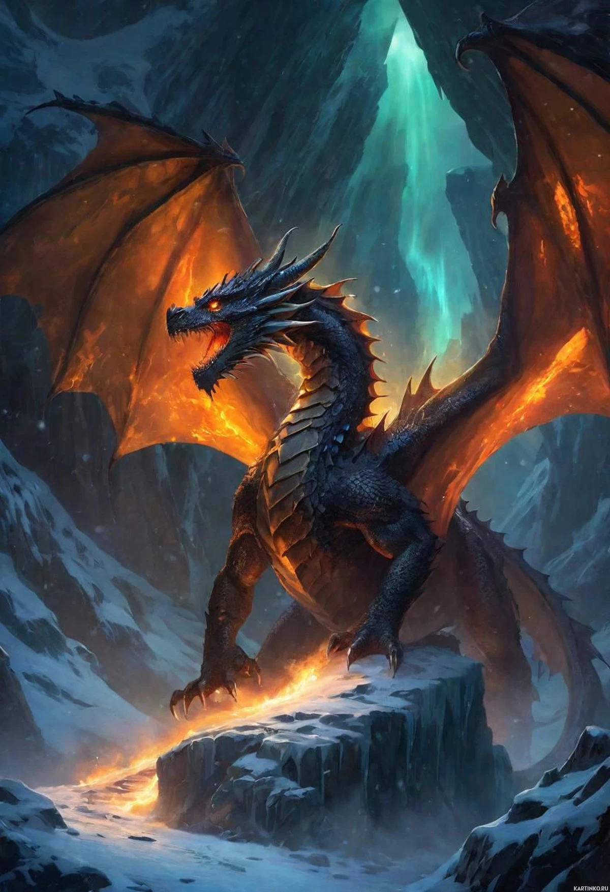a rocky outcropping in what appears to be an icy or snowy environment, possibly a mountainous region given the jagged peaks in the background. The dragon's eyes are glowing with a fierce intensity, and its mouth is open as if roaring or breathing fire. There's a bluish-white energy emanating from the dragon's back, possibly suggesting magical abilities or