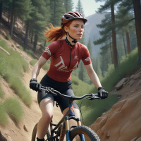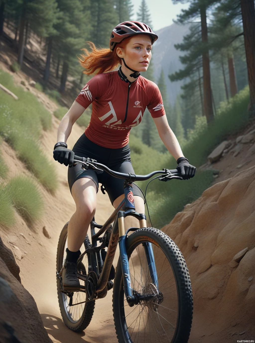 На картинке – рыжеволосая девушка в шлеме едет на велосипеде по горной тропе. Она наклонилась вперед и активно крутит педали. На ней спортивная одежда, подходящая для катания на велосипеде: майка, шорты, перчатки и кроссовки. Велосипед имеет несколько скоростей, что говорит о его конструкции для бездорожья или горного велосипеда. Тропа, по которой она едет, немощена, похоже, из земли, как видно по поднявшейся за ней пыли. Вокруг – деревья, создающие ощущение нахождения в естественной лесистой местности. Небо ясное, что говорит о хорошей погоде для активного отдыха, например, для катания на горном велосипеде.