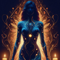 In this digital art image, there is a central figure that appears to be a woman with long hair and fair skin. She has an ethereal appearance and is depicted in profile view. Her form is humanoid but also carries some celestial or otherworldly qualities. The woman is adorned with feather-like elements that seem to radiate outward from her head, suggesting wings or perhaps a connection to the divine. These feathers are symmetrical and spread across her upper body and shoulders, contributing to an overall sense of harmony and balance in the image. She stands in front of a backdrop that features a dark, richly detailed background with intricate patterns and shapes that could be interpreted as stylized leaves or vines, which adds to the otherworldly theme of the artwork. Beneath her feet is a base decorated with symmetrical elements that mirror those on her form and in the backdrop. These symmetrical patterns create a sense of cohesion within the image. On either side of her are two lit candles, which could symbolize illumination or enlightenment. The light from these candles contrasts with the darkness behind her, highlighting her figure prominently in the composition. The overall color palette is a blend of cool tones with darker shades on the background and brighter, more luminescent hues surrounding the woman and candles. This juxtaposition creates a striking visual effect that draws attention to the central figure.