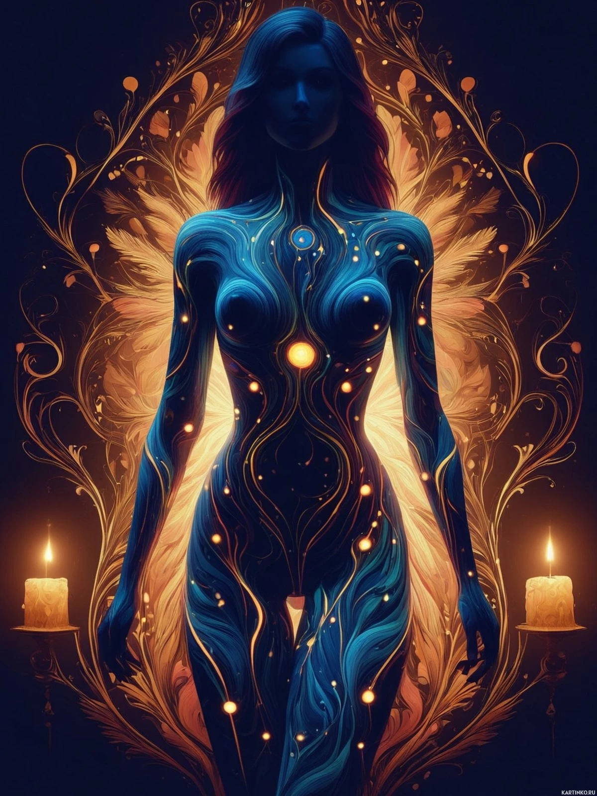 На этой картинке, выполненной в цифровой графике, изображена центральная фигура, напоминающая женщину с длинными волосами и светлой кожей. Она выглядит неземной и представлена в профиль. Её форма человеческая, но в ней угадываются небесные или потусторонние черты. Фигуру украшают элементы, похожие на перья, которые, кажется, расходятся от её головы, намекая на крылья или связь с божественным началом. Эти перья симметричны и располагаются на её верхней части тела и плечах, создавая общее ощущение гармонии и равновесия. Она стоит на фоне тёмного, богато детализированного пространства с замысловатыми узорами и формами, которые можно интерпретировать как стилизованные листья или лианы, что усиливает атмосферу инопланетности произведения. У её ног – основание, украшенное симметричными элементами, перекликающимися с деталями на её фигуре и на фоне. Эти симметричные узоры создают ощущение единства в картинке. По обе стороны от неё горят две свечи, которые могут символизировать просветление или озарение. Свет от этих свечей контрастирует с тёмным фоном, выделяя её фигуру в композиции. Цветовая палитра в целом состоит из холодных тонов с более темными оттенками на фоне и более яркими, светящимися тонами вокруг женщины и свечей. Это противопоставление создает эффектный визуальный эффект, привлекающий внимание к центральной фигуре.