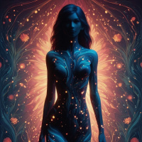 The image features a central figure that appears to be a woman with long dark hair. She has an ethereal and otherworldly appearance, with her skin seemingly translucent or a pale blue in color. Her body is adorned with intricate patterns or tattoos that look like celestial bodies or geometric shapes. The background behind the figure has a mystical ambiance with what appears to be red and orange flames or embers glowing, suggesting a fiery or intense environment. Around her are branches or tendrils with small orange flowers or blossoms scattered throughout. The overall color palette is dark with warm accents, giving the image a dramatic and mysterious feel. The style of the artwork leans towards fantasy or science fiction genres, with a focus on contrasting elements such as light and darkness, organic and geometric shapes, and natural versus mechanical elements.