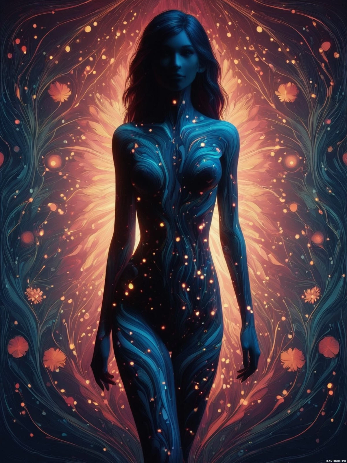 На картинке изображена центральная фигура, по-видимому, женщина с длинными темными волосами. Она выглядит неземной и загадочной, с кожей, кажущейся полупрозрачной или имеющей бледно-голубой оттенок. Её тело украшено сложными узорами или татуировками, похожими на небесные тела или геометрические фигуры. На заднем плане, позади фигуры, царит мистическая атмосфера, словно пылают красные и оранжевые языки пламени или тлеющие угли, что создаёт впечатление огненной или напряжённой обстановки. Вокруг неё – ветви или лозы, усыпанные мелкими оранжевыми цветами или бутонами. Цветовая гамма в целом тёмная, с теплыми акцентами, что придает картинке драматичный и таинственный характер. Стиль работы тяготеет к жанрам фэнтези или научной фантастики, с акцентом на контрастные элементы, такие как свет и тьма, органические и геометрические формы, а также сочетание природных и механических деталей.