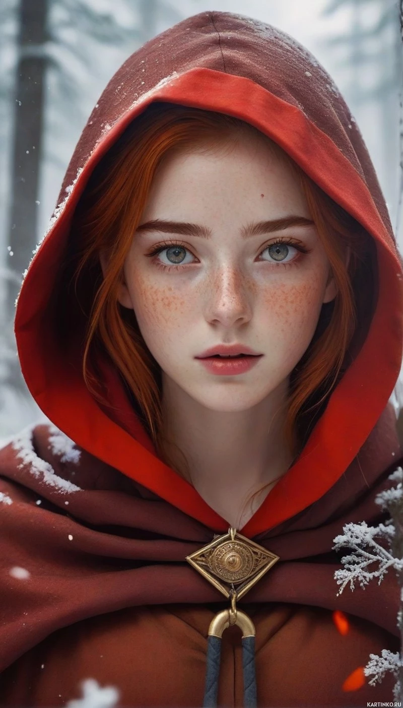 На картинке изображена девушка с рыжими волосами, в капюшоне и смотрящая прямо на зрителя. Её выражение лица нейтральное, с оттенком задумчивости. На щеках и носу заметны родинки или веснушки. Капюшон насыщенного тёмно-коричневого цвета с меховой подкладкой, словно для защиты от холода. На заднем плане видны снежинки, что указывает на зимнее время года. У девушки светлая кожа и голубые глаза.