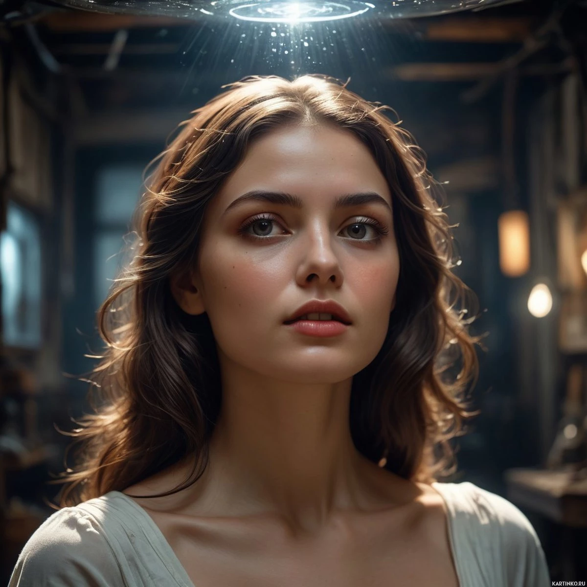Молодая женщина с длинными каштановыми волосами смотрит вверх к источнику света, расположенному на уровне ее лба, создавая впечатление нимба над головой. На ее лице нейтральное выражение, а на ней — одежда, напоминающая исторический или фэнтезийный костюм. Вокруг нее – приглушенный свет, темная деревянная текстура и каменная стена на заднем плане.