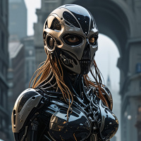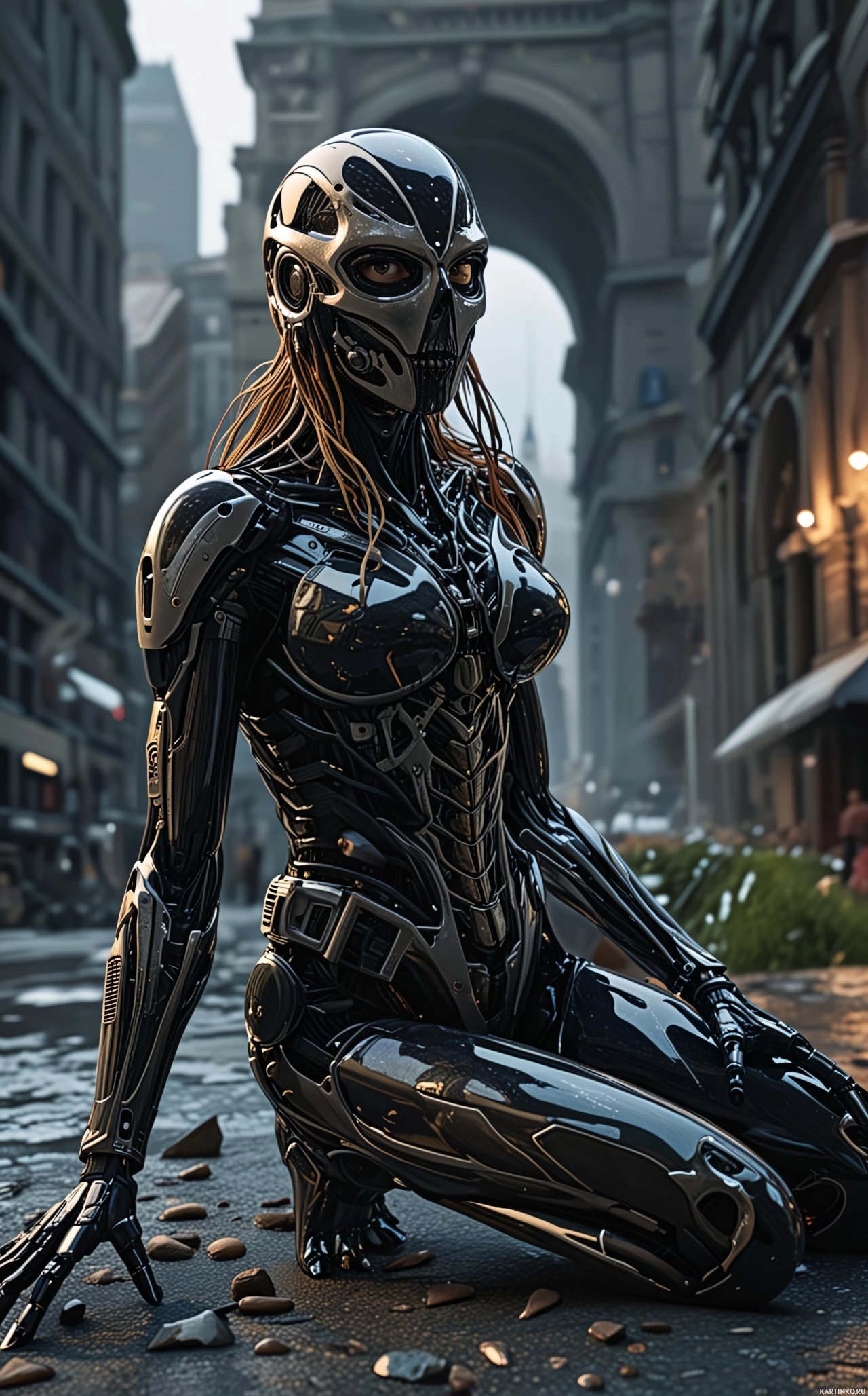На картинке изображен гуманоидный робот, находящийся, судя по архитектуре на заднем плане, в городском пейзаже, возможно, напоминающем Нью-Йорк. Робот изображен в человеческой позе, стоя на коленях на, вероятно, мокром асфальте после дождя. На нем футуристический доспех с серебристым металлическим покрытием и шлем со светящимися красными глазами, что придает ему устрашающий вид. Общая тема картинки пронизана элементами научной фантастики.