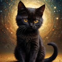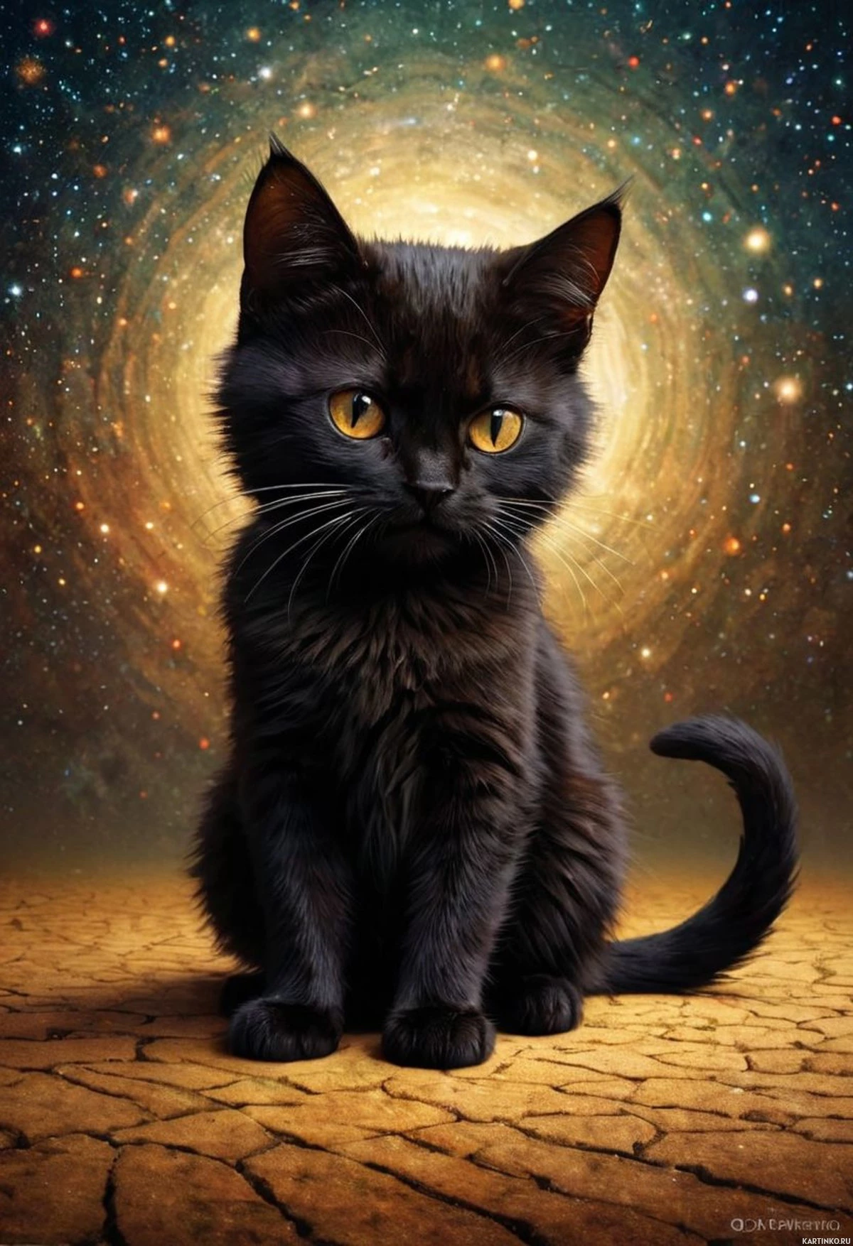 На картинке сидит чёрный кот с острыми ушками и характерными отметинами на мордочке, перед ним – безграничный космический пейзаж, усыпанный звёздами и планетами. Взгляд кота направлен за пределы кадра, придавая ему задумчивый вид. Он восседает на потрескавшейся поверхности, которая может напоминать засушливую местность или пустыню. В целом композиция создает сюрреалистичное и сказочное впечатление, соединяя обыденность с элементами фэнтези и научной фантастики.