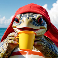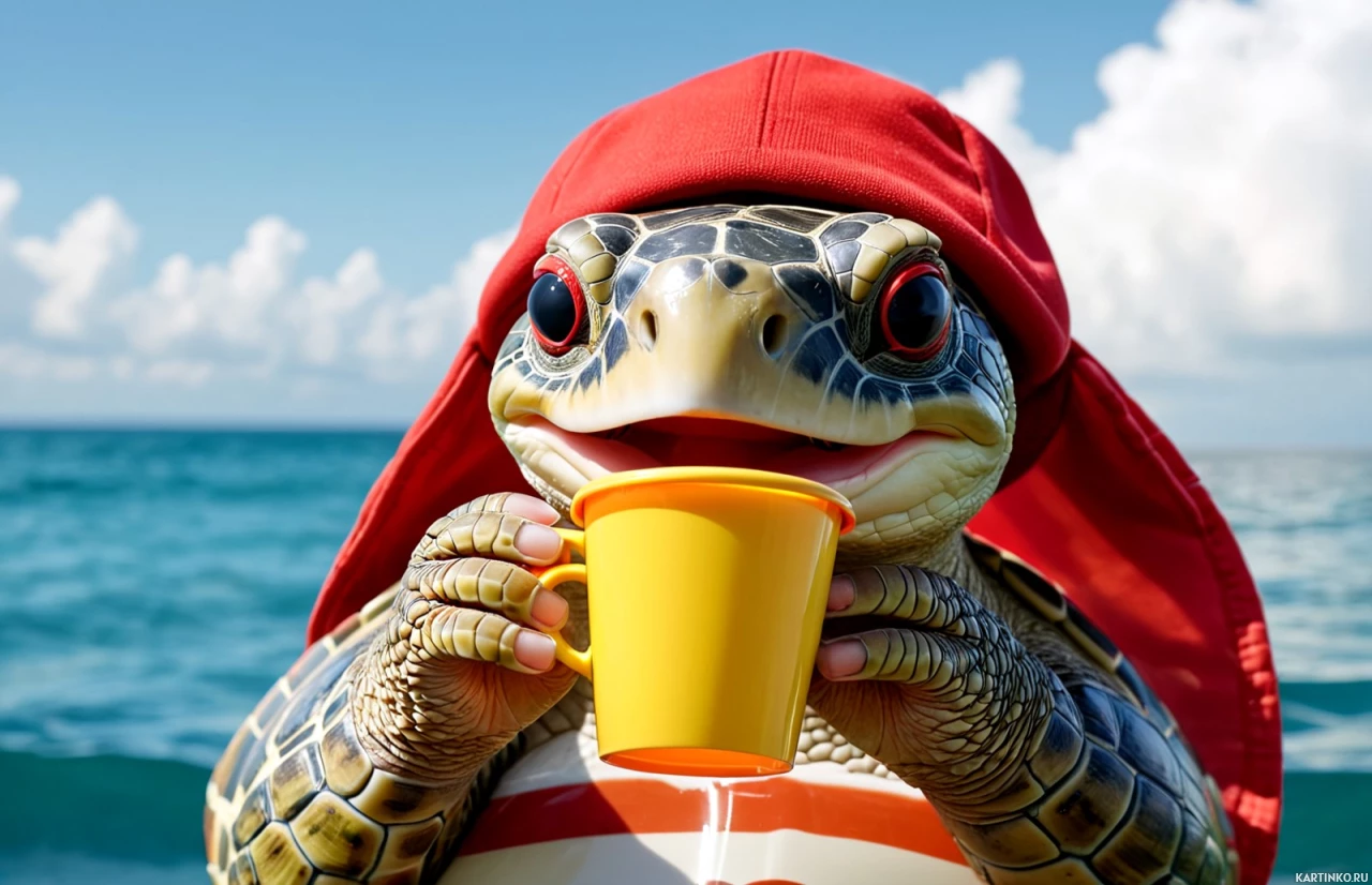 The image features a turtle dressed in a red hooded jacket and sunglasses, sitting on a yellow life preserver with a cup of coffee. The turtle is depicted anthropomorphically, as if it is enjoying the drink. It is holding the cup with its front paws and appears to be smiling at the viewer. The background suggests an ocean setting.