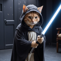 На картинке кот, переодетый в персонажа из Звездных войн. На нем надет капюшон, а в лапе он держит световой меч. Задний план – комната с приглушенным светом, создающая футуристическую атмосферу. Выражение мордочки и поза кота говорят о готовности к бою или драматичной сцене.