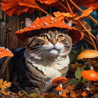 На картинке изображен котик в шляпе-грибе, сидящий среди разноцветных мухоморов. Он смотрит на зрителя, слегка приоткрыв рот, будто заснул или замурлыкал. Глаза у котика широко открыты и внимательные. На заднем плане – насыщенная осенняя сцена с падающими листьями, создающая ощущение позднего дня или раннего вечера благодаря теплым оттенкам освещения. Шерстка у котика пушистая, как у длинношерстной домашней породы, а выражение мордочки – довольное.
