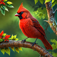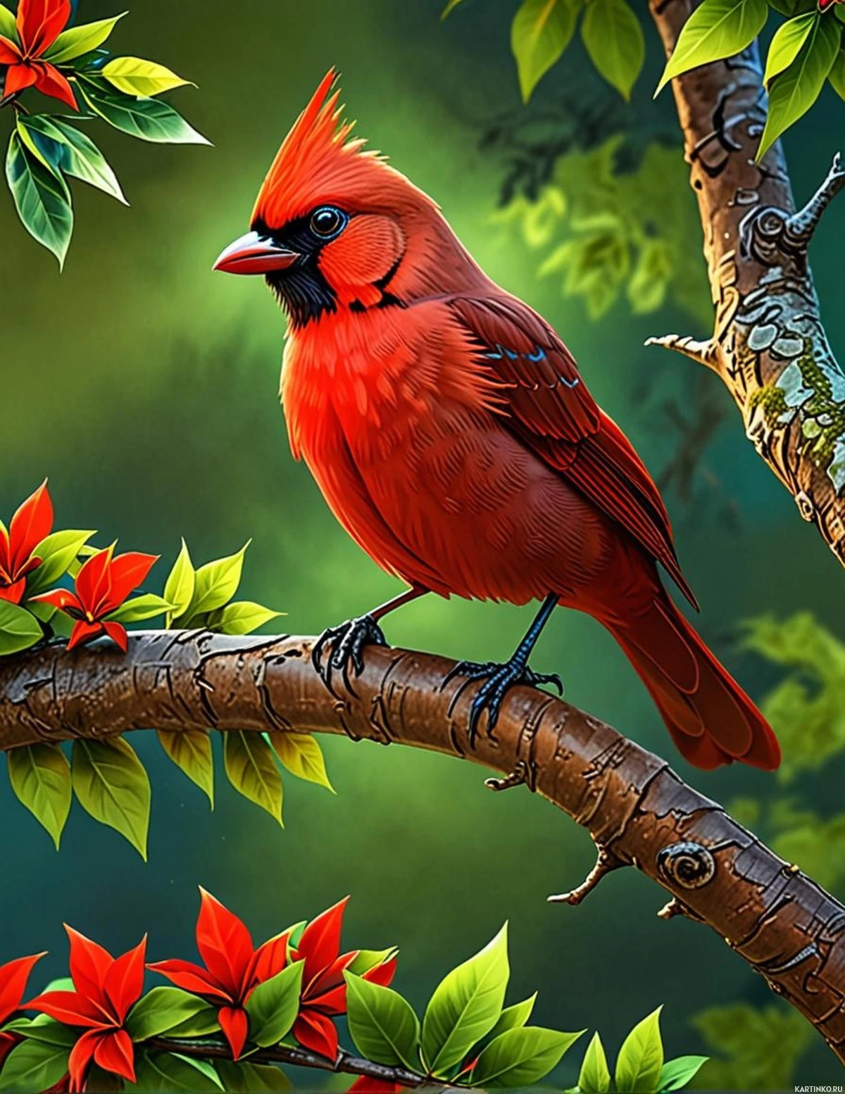 На картинке – красный кардинал, сидящий на ветке с зелёными листьями и красными цветами у основания. Вокруг веток разбросаны дополнительные красные цветы, подчеркивающие естественность пейзажа. У птицы характерные черты: чёрный клюв и заметный хохолок на голове. Фон темный, возможно, намекает на ночную сцену или лесной пейзаж со звёздами.
