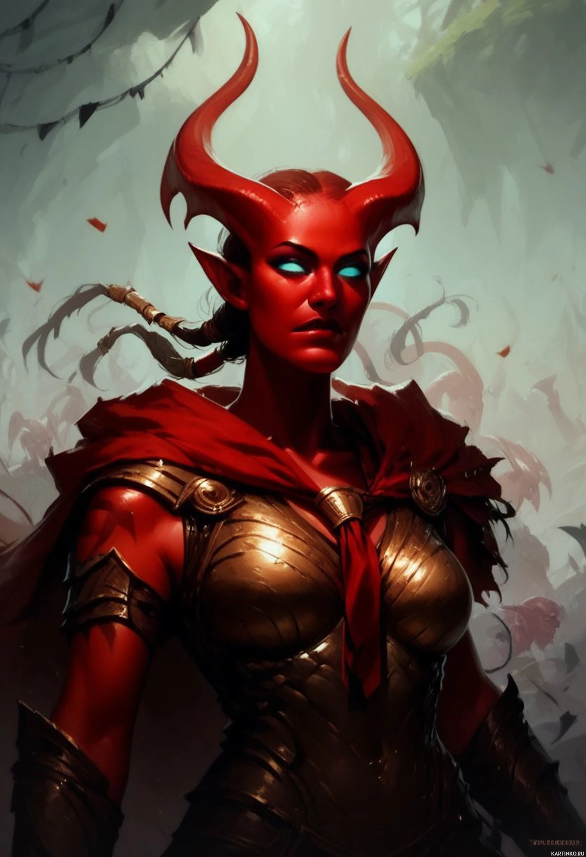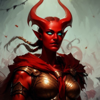 red skin, resembling a devil or demon. Her attire consists of armor with spikes and she's adorned with