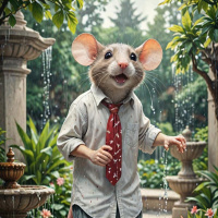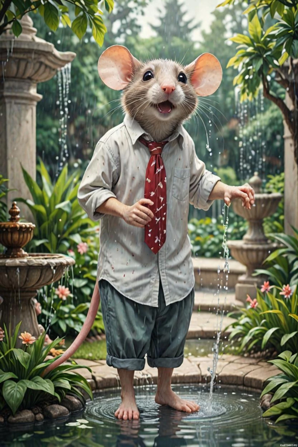 The image depicts an anthropomorphic mouse character standing on a stone pathway amidst what appears to be a rain shower, given the droplets in the air. The mouse is wearing a light brown outfit that resembles attire suitable for outdoor activities, with visible pockets and a tie loosely around its neck. It has large ears characteristic of real mice and a whimsical expression. In the background, there's an ornate archway framing a serene garden scene, complete with water features like fountains and potted plants. The image is rich in detail and color, capturing a moment that seems both ordinary and extraordinary due to its anthropomorphic subject.