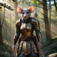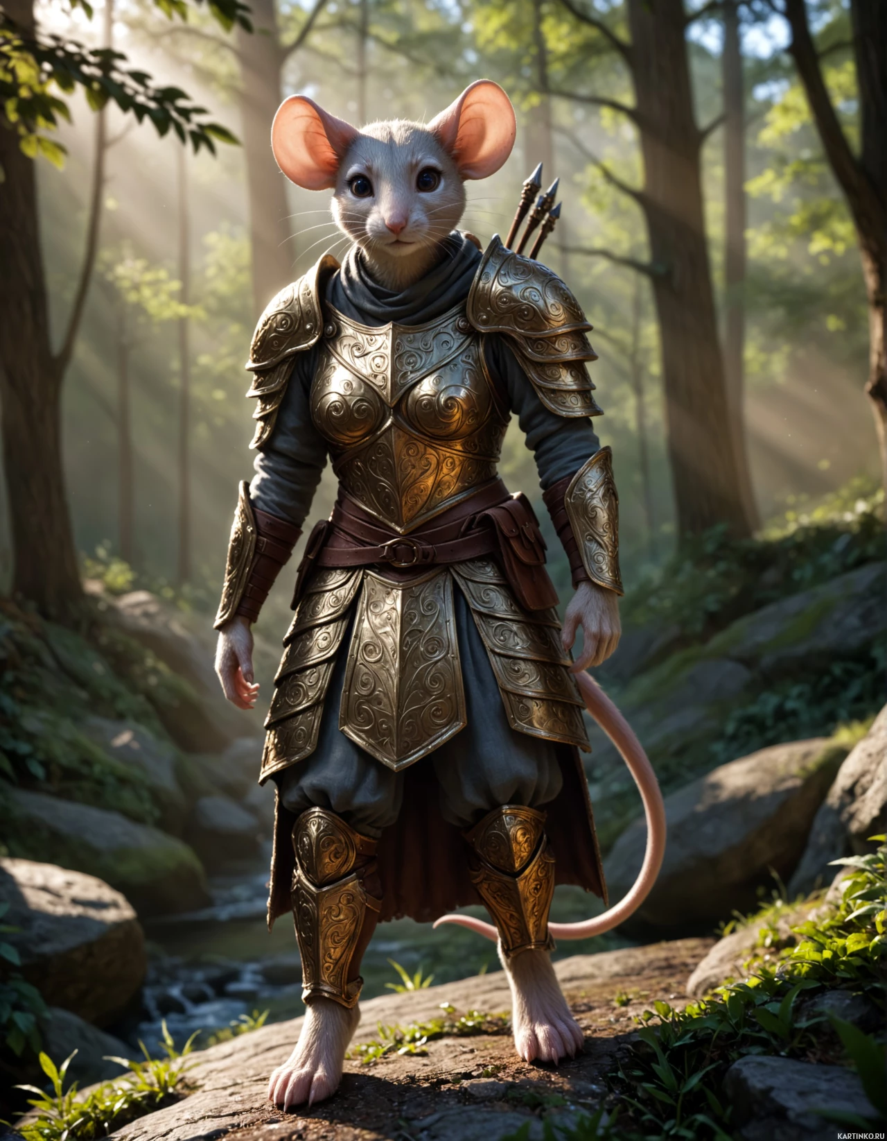 На картинке изобранена фантастическая сцена: в лесной полянке стоит антропоморфный мышонок в доспехах. Мышонок, являющийся центральным персонажем, одет в кольчужный нагрудник и скрестил руки на груди. В правой руке он держит меч. На шее у мышонка что-то вроде пояса или шарфа. Голову мышонка украшает простая корона. Лесной пейзаж включает в себя разнообразные растения и деревья. По поляне разбросаны камни. На заднем плане извивается ручей, петляющий среди деревьев. Солнечный свет пробивается сквозь листву, создавая яркое, но пятнистое освещение на всей картинке.