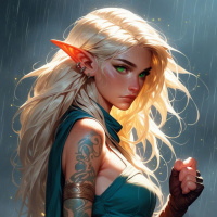 In the image, a fantasy-themed character is depicted. The individual has blonde hair and pointed ears characteristic of an elf in many fantasy stories. They are dressed in a medieval outfit consisting of a green tunic with gold trim, leather armor, and boots, suggesting a warrior or combatant role within their narrative context. The character is set against a dark background that contrasts with the bright lighting on their face, which highlights their features.