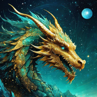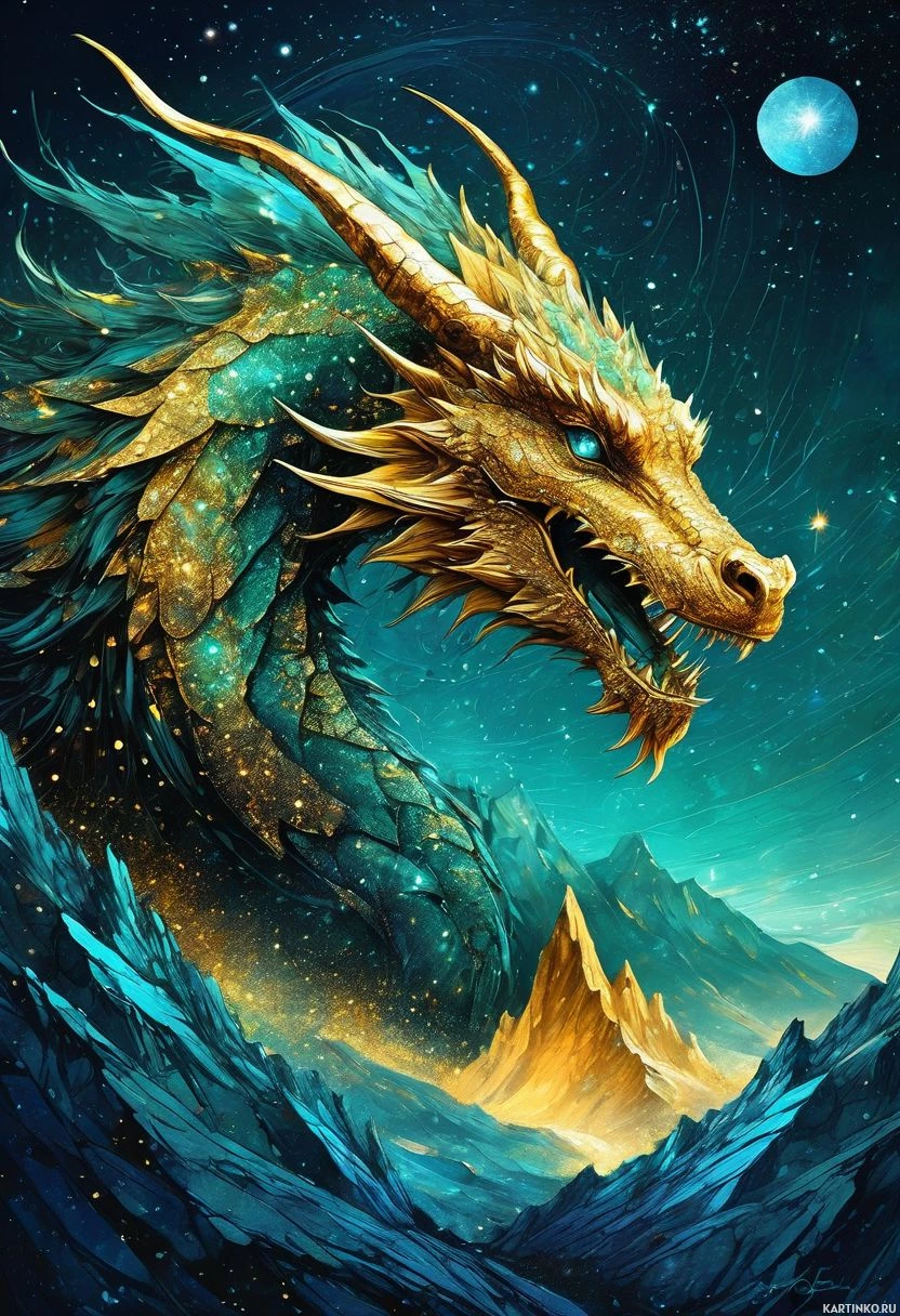 На картинке запечатлена фантастическая сцена с драконом. Дракон выполнен в золотисто-синей гамме, его чешуя словно выгравирована, что придает ему величественный вид. На заднем плане – ночное небо с яркой луной, создающей атмосферу таинственности и волшебства. На переднем плане видны скалы, подчеркивающие суровость пейзажа. Глаза дракона светятся, и кажется, что он смотрит на зрителя с пристальным взглядом. Общая композиция напоминает сцену из фэнтезийного или мифологического повествования, где мифическая природа существа подчеркивается детализированным дизайном и атмосферной подсветкой.