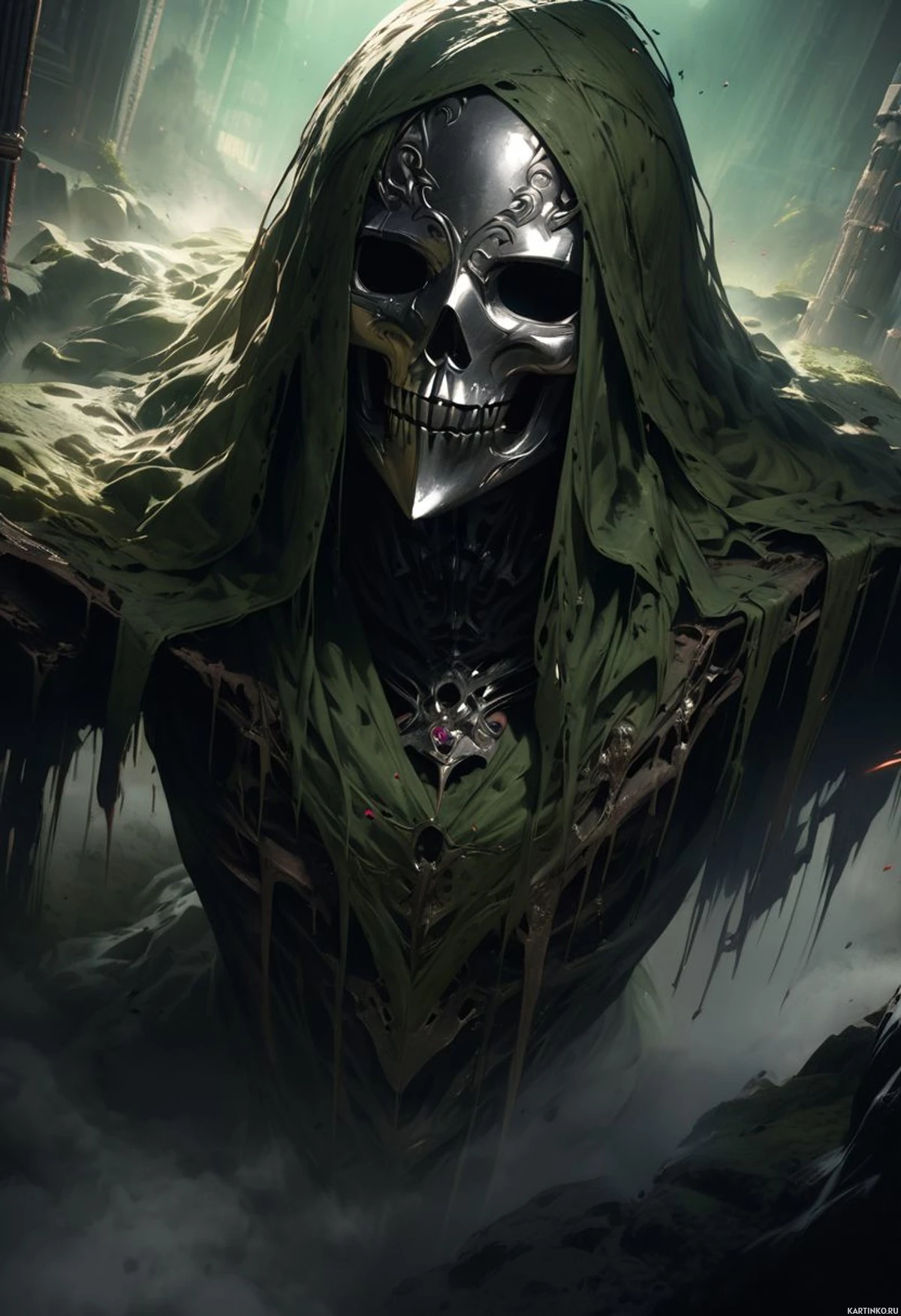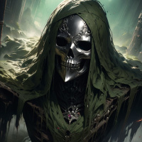 hooded cloak that is smeared with what looks like dirt or moss. A prominent feature of the character's appearance is a skull mask covering their face, which has two large eye sockets where a pair of glowing