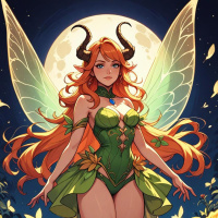 The image depicts a fantasy-themed illustration of a red-haired figure with wings, resembling a fairy, set against the backdrop of a night sky and a full moon. The character is adorned in a green outfit and is surrounded by flowers, including roses, which are illuminated under the moonlight. She stands on a rock formation, her arms outstretched as if embracing the magical atmosphere around her. The overall mood of the image is enchanting and serene, capturing the essence of a fairy or mythical being in a whimsical setting.