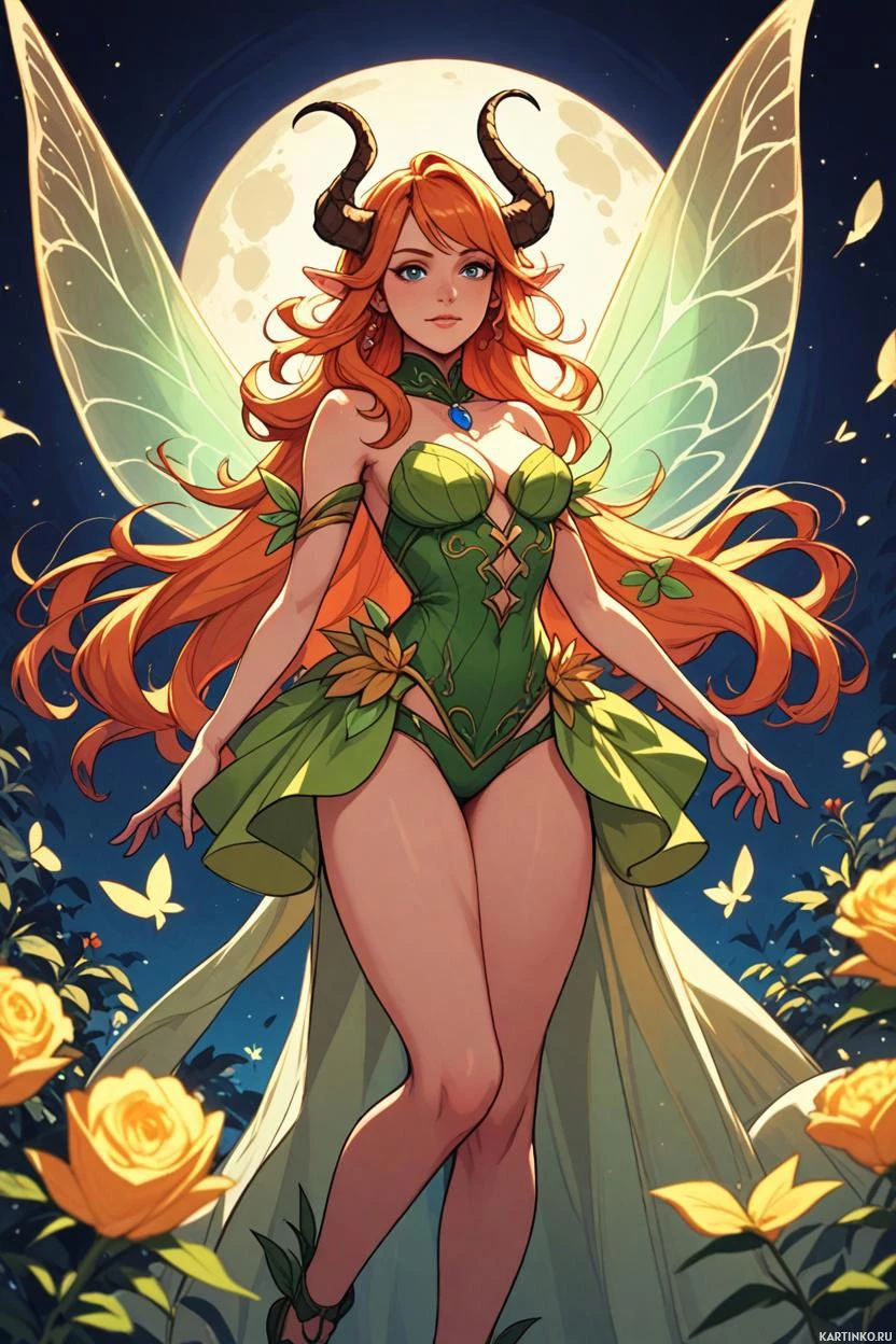 Картинка изображает фантастическую иллюстрацию: рыжеволосая девушка с крыльями, похожая на фею, на фоне ночного неба и полной луны. Она одета в зелёный наряд и окружена цветами, среди которых розы, освещённые лунным светом. Она стоит на скале, руки раскинуты, будто обнимая волшебную атмосферу вокруг. Общее настроение картинки – очарование и безмятежность, передающее сущность феи или мифического существа в сказочном окружении.
