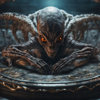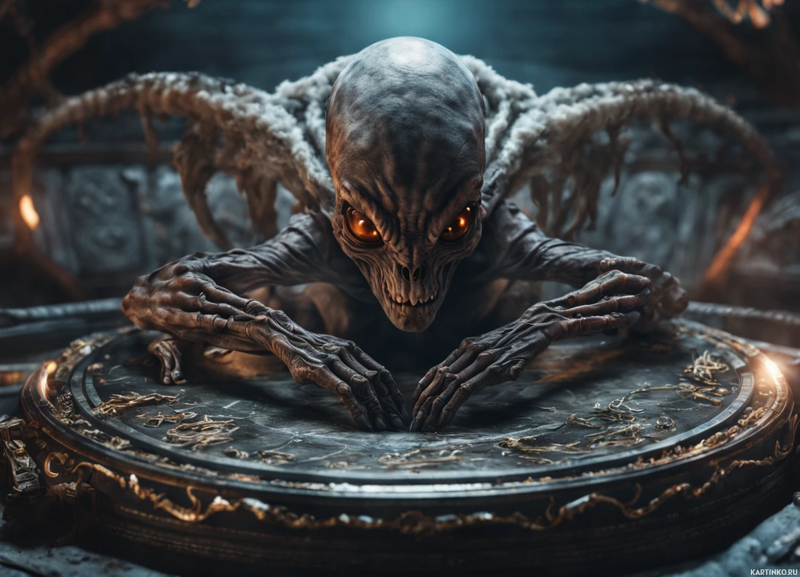 На картинке изобранена сцена фэнтези-хоррора с грозным существом в центре. Существо имеет оборванный, человекоподобный вид, с темной кожей и белыми волосами. У него большие крылья, слегка порванные по краям. Глаза красные и кажутся неестественно светящимися. Рот широко открыт в рычащем выражении, обнажая острые зубы. Существо, кажется, сидит за столом, вокруг которого разбросаны различные предметы. Место действия окутано полумраком и создаёт мрачную атмосферу. На столе стоят свечи, что добавляет жутковатости происходящему.
