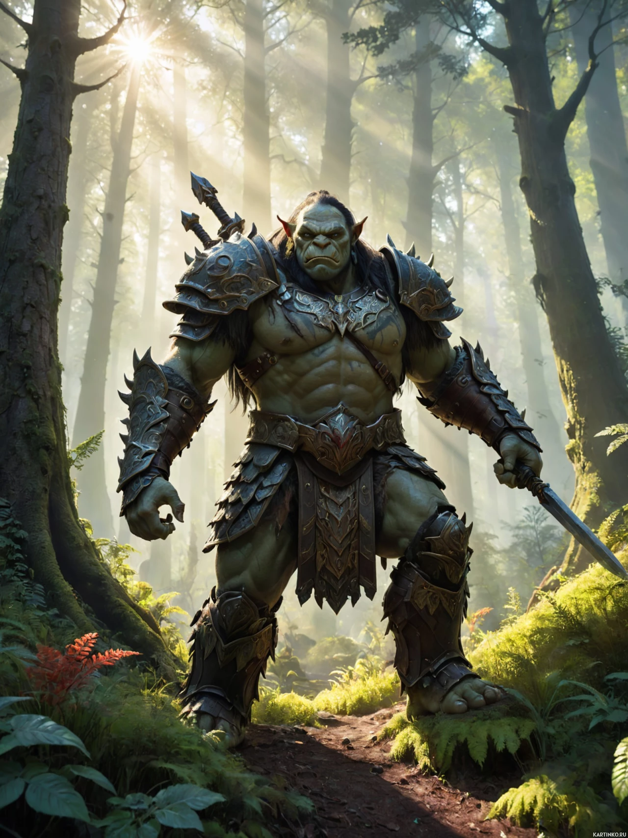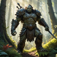Картинка изображает персонажа, похожего на орка, в фэнтезийном окружении. Орк стоит прямо, с мускулистой фигурой, зеленой кожей и острыми зубами, виднеющимися через открытый рот. На нём доспехи из костей и кожаный упряжь, украшенные ожерельем и поясом, декорированными, кажется, зубами или когтями. Персонаж находится в лесу с пышной зеленью и высокими деревьями с замысловатой корой. Солнечный свет пробивается сквозь листву, освещая сцену пятнами света. Перед персонажем – тропинка, уходящая в глубь леса.