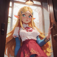 На картинке изображен мультяшный персонаж с золотистыми волосами, заплетенными в две косички. У нее заостренные ушки, выдающие эльфийские черты, и голубые глаза, выражающие спокойствие или задумчивость. Она одета в белую рубашку с черной воланом на воротнике и темно-пурпурную юбку с золотыми акцентами. Правая рука нежно покоится на бедре, а левая слегка прислонена к стене рядом с головой. На заднем плане виднеется интерьер с окном, через которое проникает дневной свет. Дизайн персонажа детализирован, с тенями, создающими объем, и она стоит перед дверью или входом, ведущим в светлое пространство.