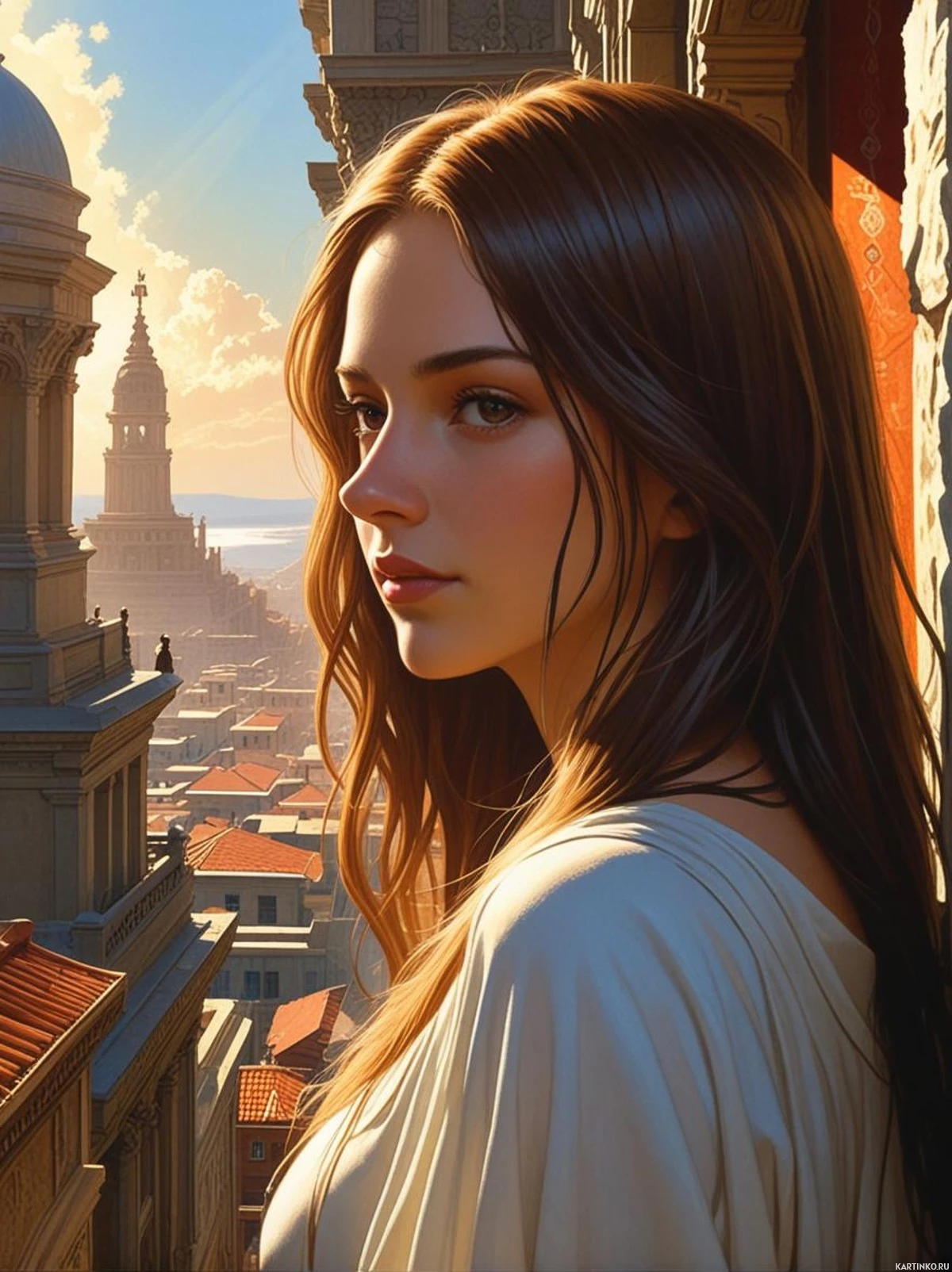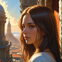 На картинке молодая женщина с длинными каштановыми волосами опирается на каменную стену, с которой открывается вид на оживленную городскую улицу. На ней кремовая блузка с воротничком в рюшами, и она кажется погруженной в раздумья. Солнце дарит сцене тёплое сияние, освещая старинные здания и создавая ощущение спокойствия на фоне городской суеты внизу.