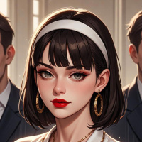 На картинке изображен цифровой персонаж, похожий на молодую девушку, с характерными для определенного стиля видеоигр или анимации чертами. У нее каштановые волосы до плеч, косая челка, яркая красная помада и тщательно прорисованные брови. Выражение лица нейтральное, немного задумчивое. Она одета в топ с высоким воротником и кружевной отделкой на шее, а также носит много украшений, включая, вероятно, золотую цепочку или медальон. Освещение придает картинке почти трехмерный эффект, создавая ощущение глубины. Ее взгляд направлен прямо перед собой.