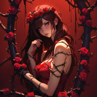 The image depicts a woman with red hair wearing an outfit that has floral designs, possibly indicating she is a character from a fantasy or gothic theme. She has accessories such as a headband and what appears to be a mask with a heart-shaped design on her chest area. The background features dark tones with red flowers that resemble roses, contributing to the overall eerie or romantic atmosphere of the piece.