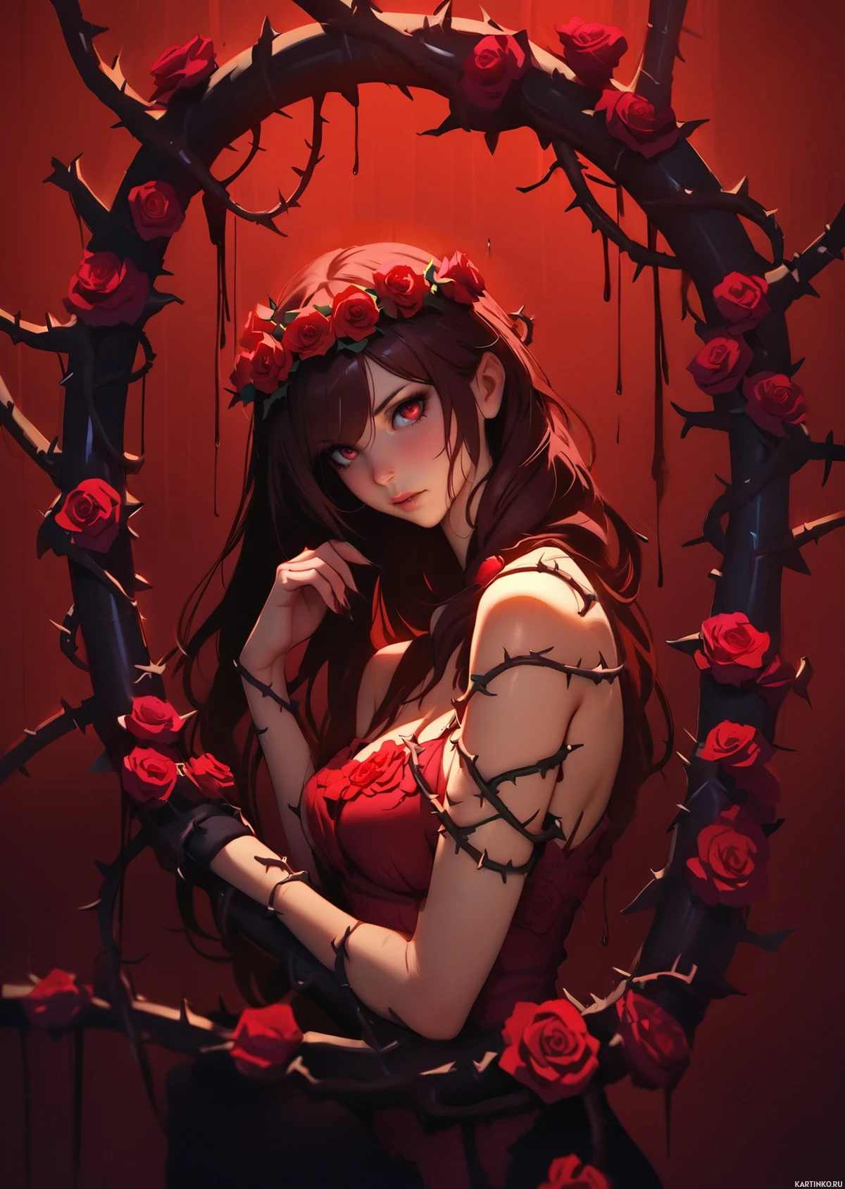 На картинке изображена женщина с рыжими волосами в наряде с цветочным узором, что может указывать на её принадлежность к миру фэнтези или готики. У неё на голове ободок, а на груди – маска с сердечком. Фон выполнен в тёмных тонах с красными цветами, похожими на розы, что создаёт загадочную или романтичную атмосферу.